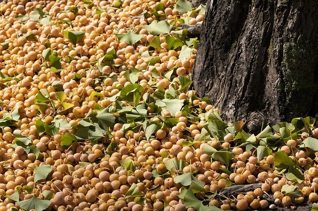 은행나무는 살아있는 화석이라 불릴 만큼 지구 상에서 가장 오래된 나무 열매라고 합니다. 나무에 암과 수 구별이 있어 암나무는 수나무에서 날아온 꽃가루를 만나야만 열매를 맺을 수 있습니다. 열매 바깥쪽의 외과피에서는 다육성으로 악취가 나며, 외과피 안쪽에 2개의 모서리가 있는 흰색의 단단한 중과피를 가진 원형의 종자를 은행이라고 합니다. 중과피 안쪽에 갈색 피막의 내종피가 있고 이 속에 청록색의 배젖이 있습니다.