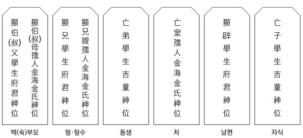 아버지는 ‘고(考)’, 어머니는 ‘비(妣)’, 조부모는 ‘조고(祖考)’, ‘조비(祖妣)’, 증조부모는 ‘증조고(曾祖考)’, ‘증조비(曾祖妣)’라 하여 앞에 현(顯)을 써서 ‘顯考(현고), 顯妣(현비), 顯祖考(현조고), 顯祖妣(현조비), 顯曾祖考(현증조고), 顯曾祖妣(현증조비)’라고 쓴다. 남편은 顯辟(현벽)이라고 쓰며, 아내는 ‘顯(현)’을 쓰지 않고 亡室(망실) 또는 故室(고실)이라 쓴다. 형은 顯兄(현형), 형수는 顯兄嫂(현형수), 동생은 亡弟(망제), 또는 故弟(고제), 자식은 亡子(망자), 또는 故子(고자)라고 쓴다.