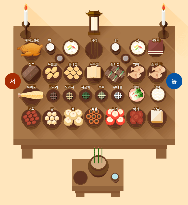 - 어동육서(魚東肉西) : 생선은 동쪽에, 고기는 서쪽에 놓는다.