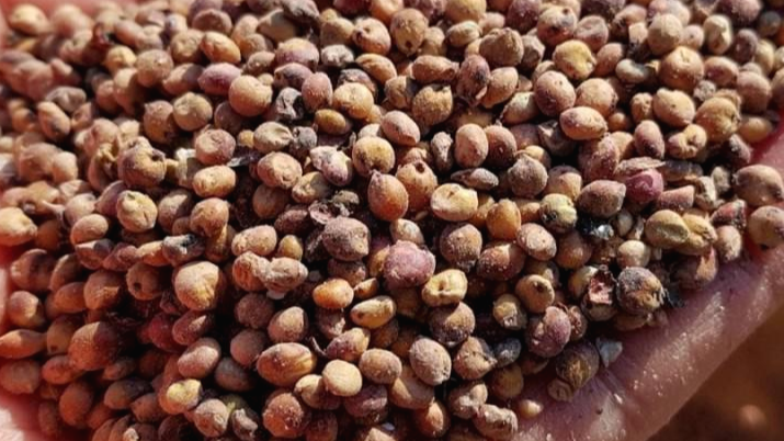 국산 수수는 이렇게 낟알이 둥근 편이며 붉은 속 껍질이 남아 있고 반투명 낟알은 거의 없는 상태입니다.