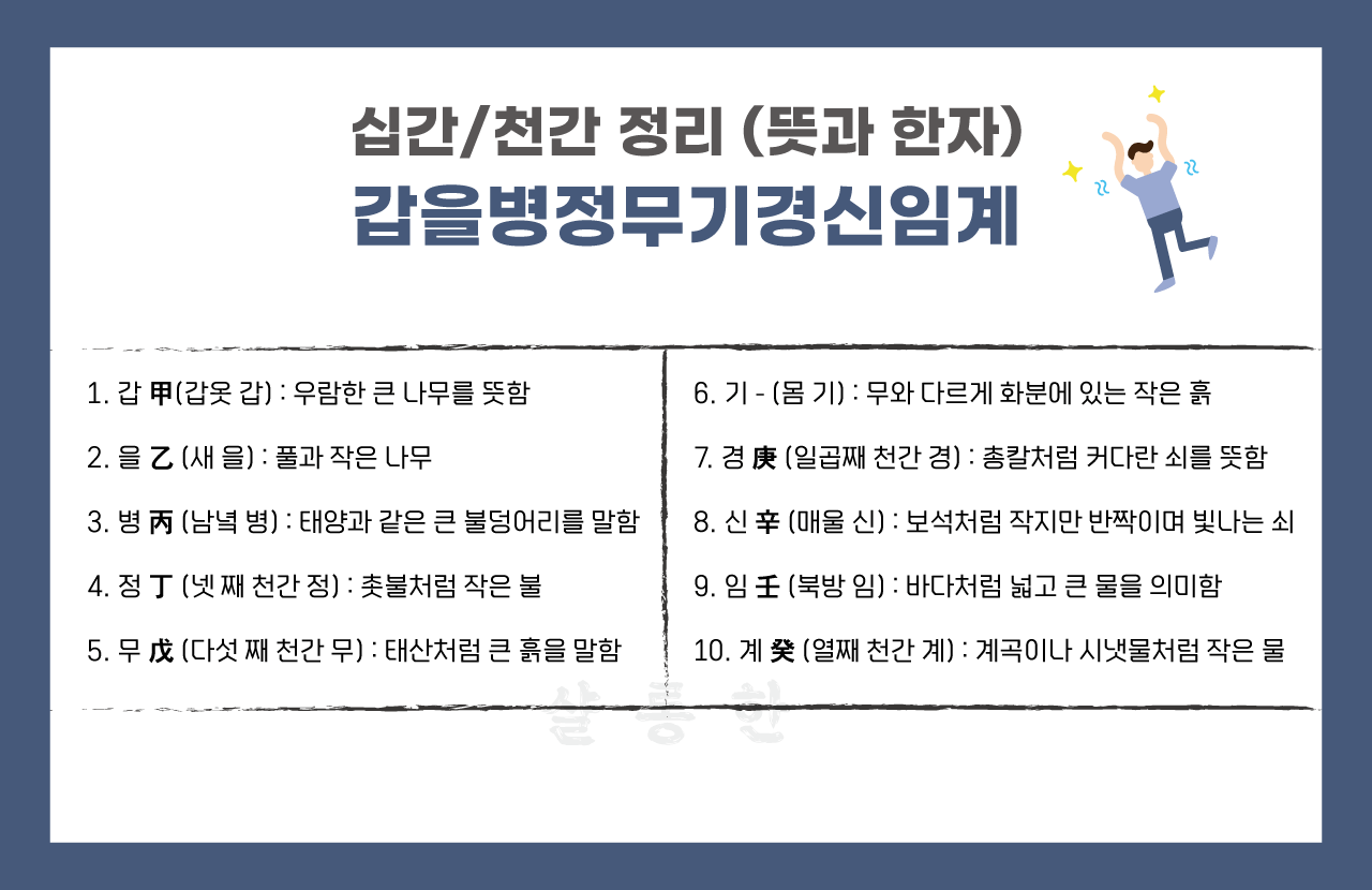 ●천간(十干) = 甲(갑) 乙(을) 丙(병) 丁(정) 戊(무) 己(기) 庚(경) 辛(신) 壬(임) 癸(계) (10개)