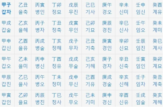 천간(십간)의 10개와 지지(십이지)의 12개를 조합하여 총 60개의 육십갑자를 만들어 우리는 각 해마다 이를 적용합니다. 60 갑자의 적용법은 아래와 같습니다.